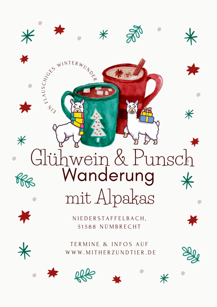 Lust auf ein weihnachtliches Abenteuer der besonderen Art? Unsere festlich geschmückten Alpakas warten schon darauf, mit dir durch die winterliche Landschaft zu spazieren – begleitet von dampfendem Glühwein oder fruchtigem Punsch, gemütlicher Stimmung und unvergesslichen Fotomomenten.
